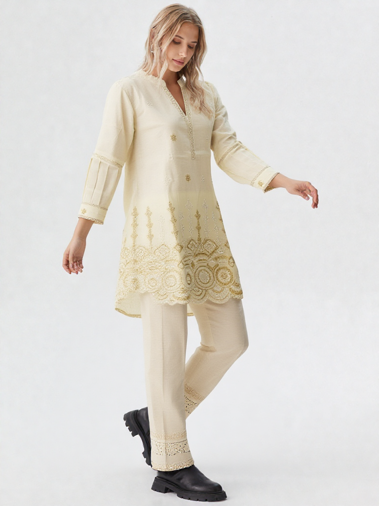 Design & Detailing- Embroidered with zari work, 3 quarter sleeves, Upper lining, Full Length Lower with schiffli work,